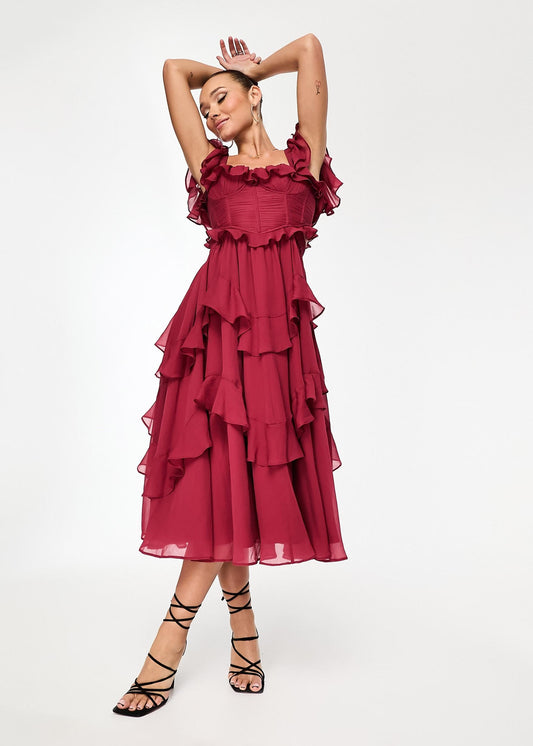 Robe longue rouge à volants élégante