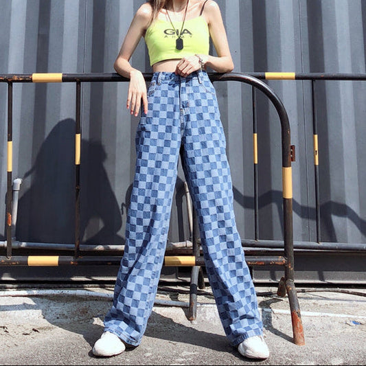 Keira – Pantalon à carreaux bleu à taille haute et jambe large