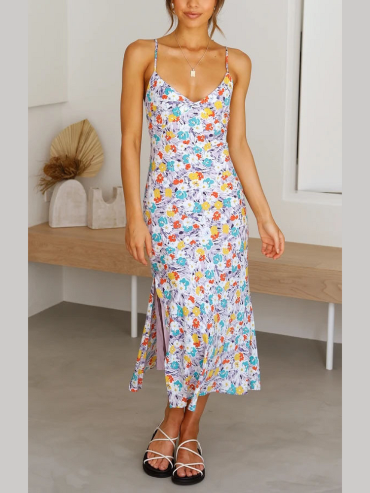 Son imprimé floral délicat évoque la douceur des beaux jours, tandis que sa fente subtile sur la jupe ajoute une pointe de sensualité discrète, idéale pour rester à la fois chic et décontractée. Sans manches, elle laisse les épaules dégagées pour un look aéré et estival, parfait pour affronter la chaleur avec style.