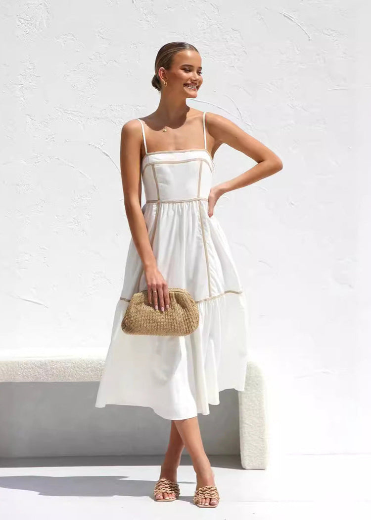 - Biais contrastant taupe sur fond blanc, soulignant le col, les bretelles et les volants.