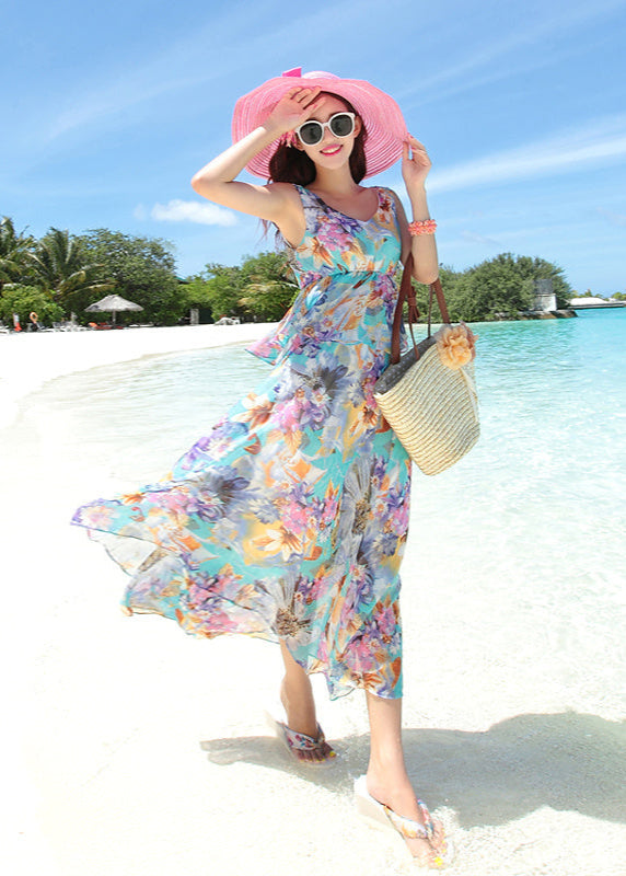 Laissez-vous séduire par cette robe midi fluide en chiffon ornée d’un motif floral coloré (vert, bleu ciel, violet & orange). Sa taille haute cintrée et sa jupe ample garantissent une silhouette féminine et une liberté de mouvement idéale pour les journées d’été.