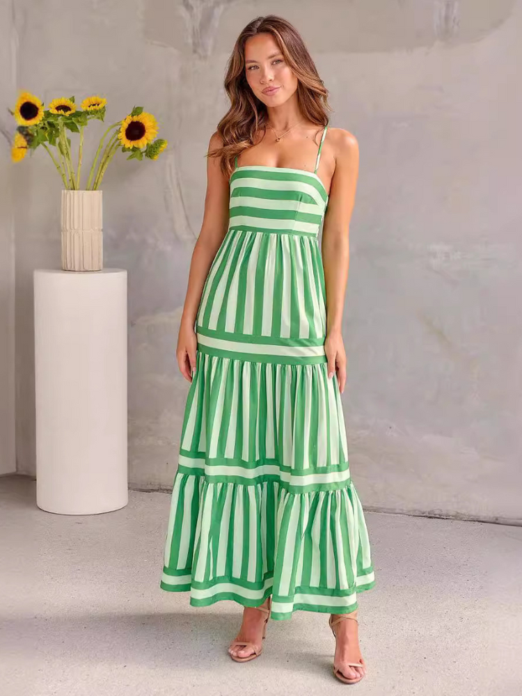 Son imprimé rayé positionné avec précision met en valeur les lignes du corps et crée un effet visuel flatteur, accentuant la taille et affinant la silhouette. La coupe fluide et légère permet une grande liberté de mouvement et assure un tombé élégant à chaque pas.