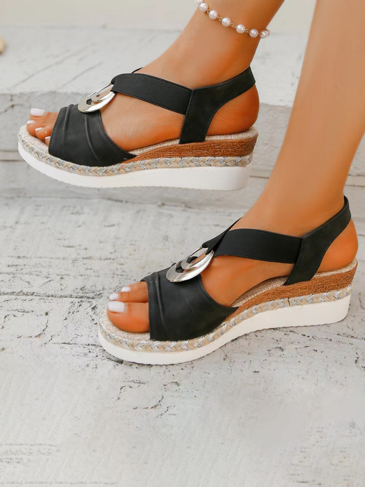 Le design peep-toe (bout ouvert) met joliment en valeur les orteils, tandis que les bandes croisées élastiques assurent un maintien confortable du pied, sans pression. Le détail décoratif en métal argenté, placé sur le dessus, ajoute une note sophistiquée et originale à l'ensemble.